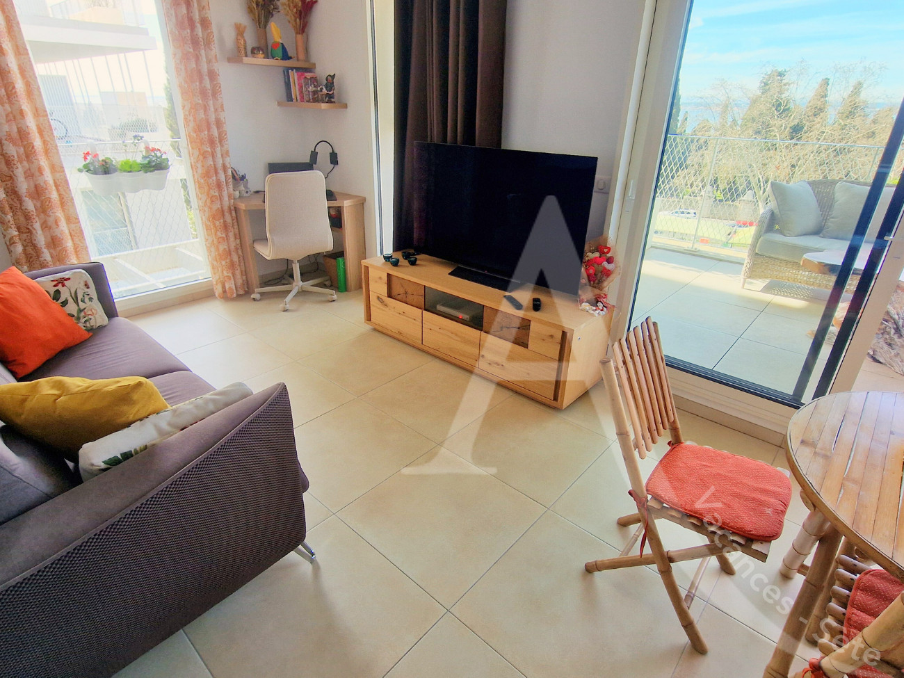 Le coin séjour avec télévision dispose d'un canapé clic-clac (140 cm) et d'un ventilateur.